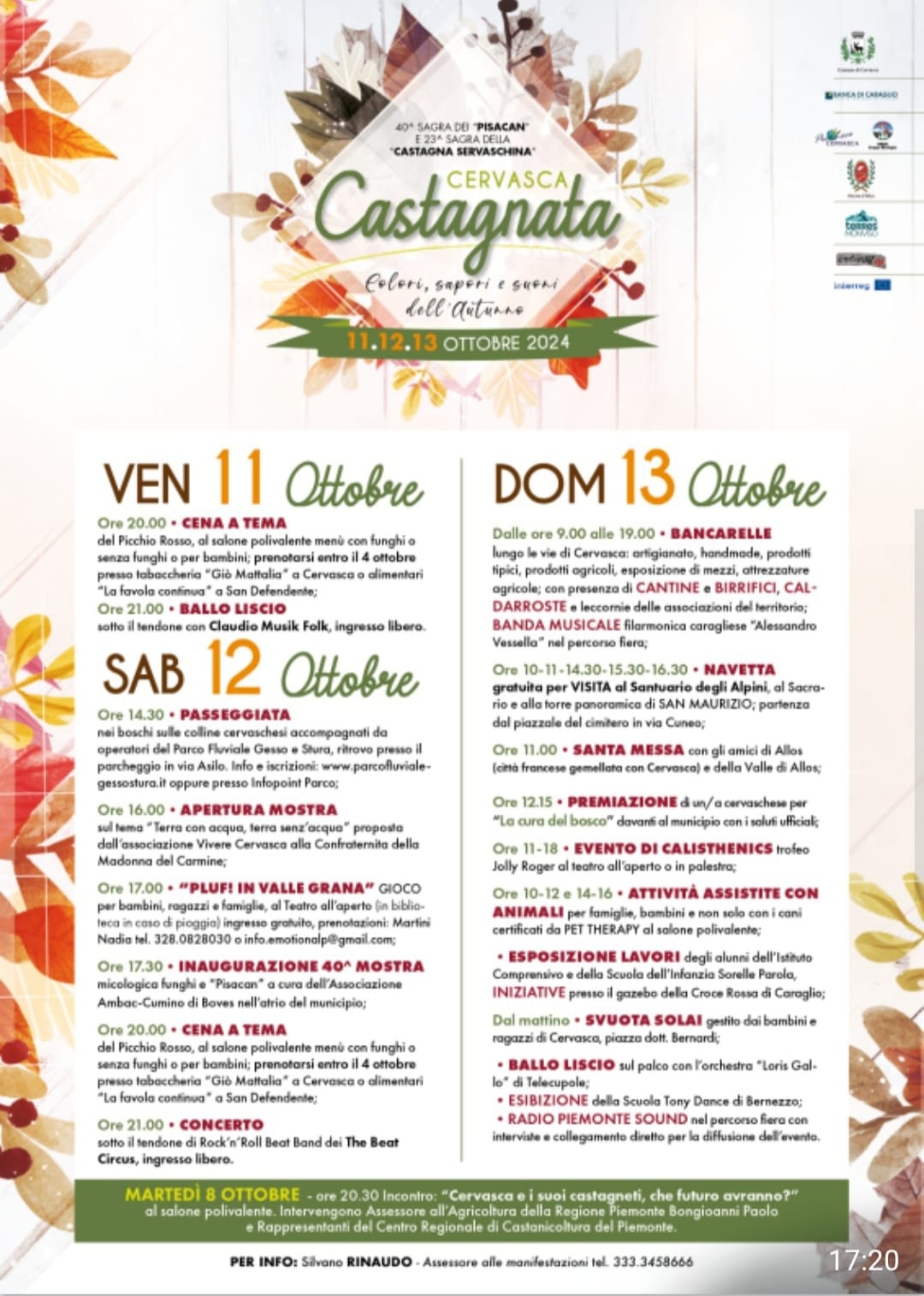 - Dalle ore 9 alle ore 19, bancarelle lungo le vie di Cervasca con cantine, birrifici, vendita di caldarroste e performance della banda musicale