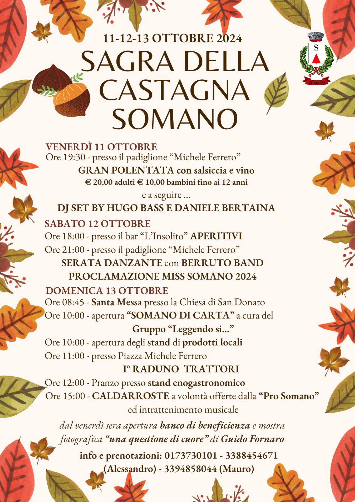 Domenica 13 ottobre sarà una giornata ricca di eventi. La mattinata inizierà con la Santa Messa alle 08:45 presso la Chiesa di San Donato. Alle 10:00, si apriranno le attività culturali con "Somano di Carta", un’iniziativa curata dal gruppo "Leggendo si…", seguita dall’apertura degli stand di prodotti locali, che offriranno ai visitatori un assaggio delle specialità gastronomiche del territorio. Alle 11:00, in Piazza Michele Ferrero, avrà luogo il primo raduno di trattori, un evento che onora le radici agricole di Somano e riunisce appassionati di mezzi agricoli di tutte le età.