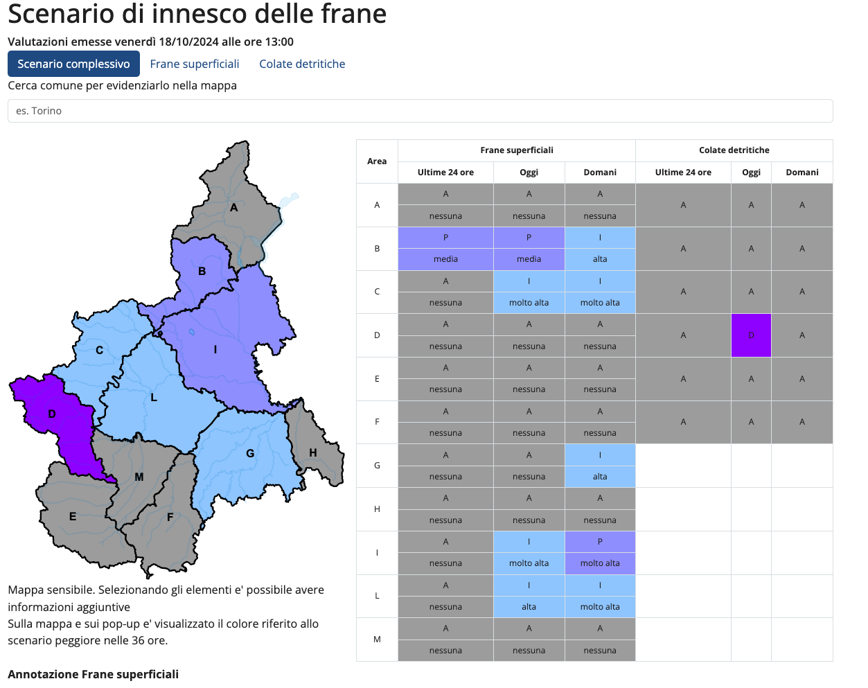 Lo scenario di innesco delle frane (vedi sotto) impone il massimo livello di attenzione nelle zone montane dell’Alta Valle di Susa e delle valli Chisone, Pellice e Po, per le quali per la giornata di oggi sono previsti "possibili inneschi che interessano estesi settori delle valli alpini".