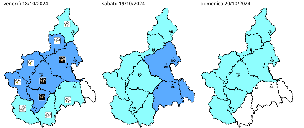 "Oggi (venerdì 18 ottobre, ndr) – si legge nella previsione di Arpa – ancora precipitazioni intense sul nord e attivazione di nuove precipitazioni e temporali localmente forti nel pomeriggio sulle pianure centrali e a ridosso dei rilievi tra Alpi Graie e Cozie. Attenuazione delle precipitazioni nella sera-notte. Sabato nuovo fronte in arrivo da est e progressiva estensione da est verso ovest nella notte tra sabato e domenica per poi esaurirsi a ridosso dei rilievi occidentali, con piogge deboli al più moderate".