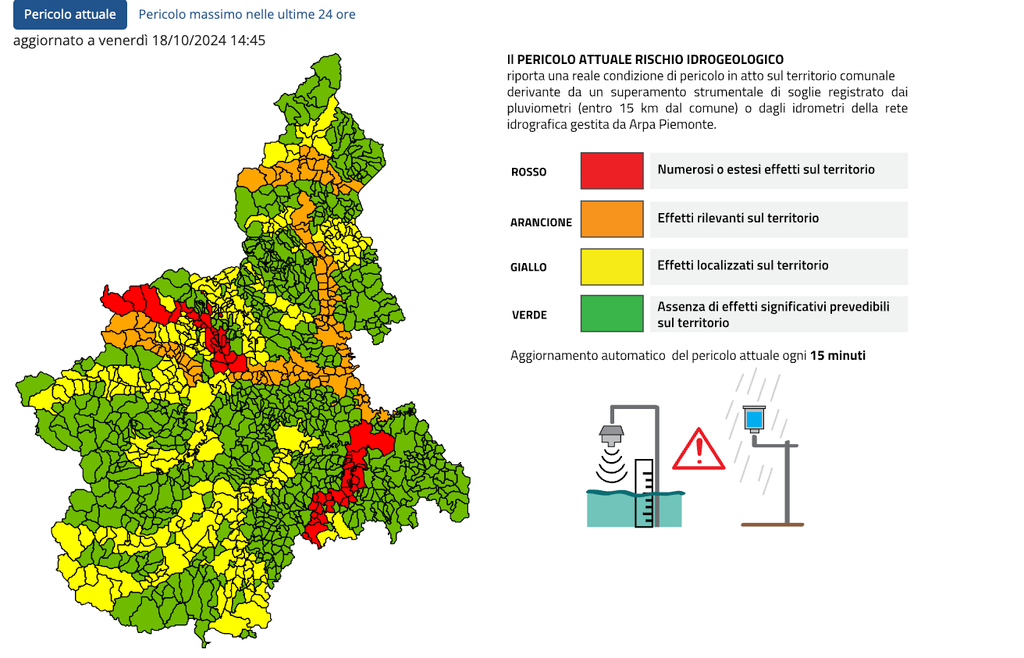 Tutto il Piemonte in giallo nelle giornate di oggi e domani. E’ il livello di allerta che l’Agenzia Regionale per l'Ambiente (Arpa) ha diramato col suo quotidiano bollettino delle 12, in ragione della perturbazione che continua a interessare un’ampia zona del Nord Ovest con danni anche significativi nella vicina Liguria.