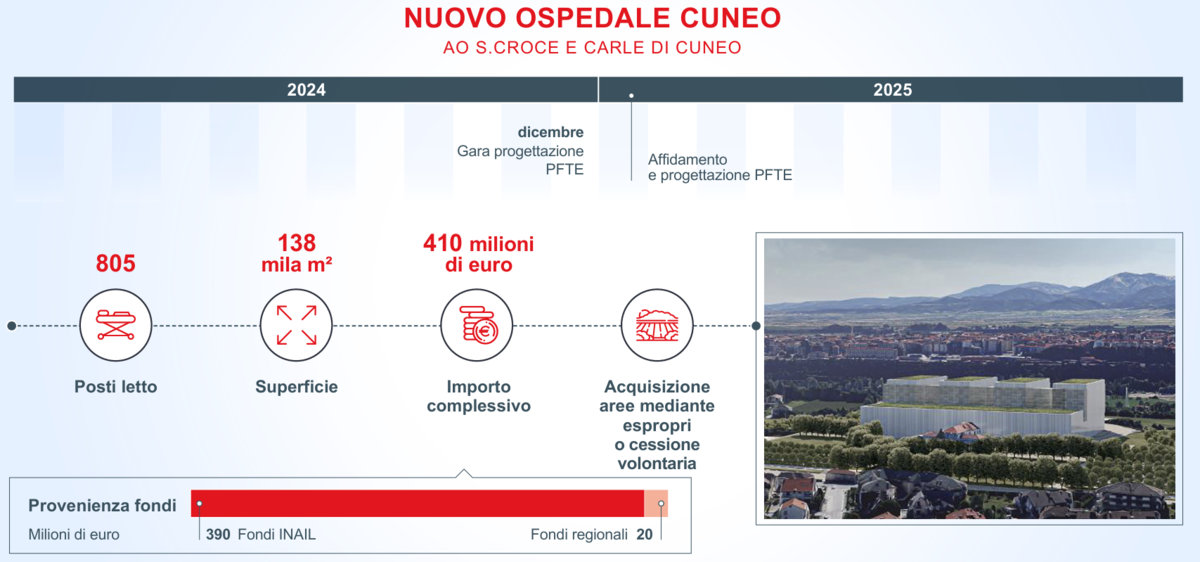 In un caso – quello del nuovo ospedale di Savigliano – si è parlato di firma del contratto per il progetto di fattibilità tecnico economica e il completamento della progettazione, e di approvazione del progetto di fattibilità e consegna dei documenti all’Inail per la metà del 2025. Per quanto riguarda il nuovo ospedale unico di Cuneo, invece, si guarda a dicembre per la presentazione da parte dell’Aso S. Croce e Carle di Cuneo e il direttore generale Livio Tranchida della gara di affidamento del progetto di fattibilità tecnico economica e alla partenza dei lavori nel 2027 e alla loro conclusione nel 2032.