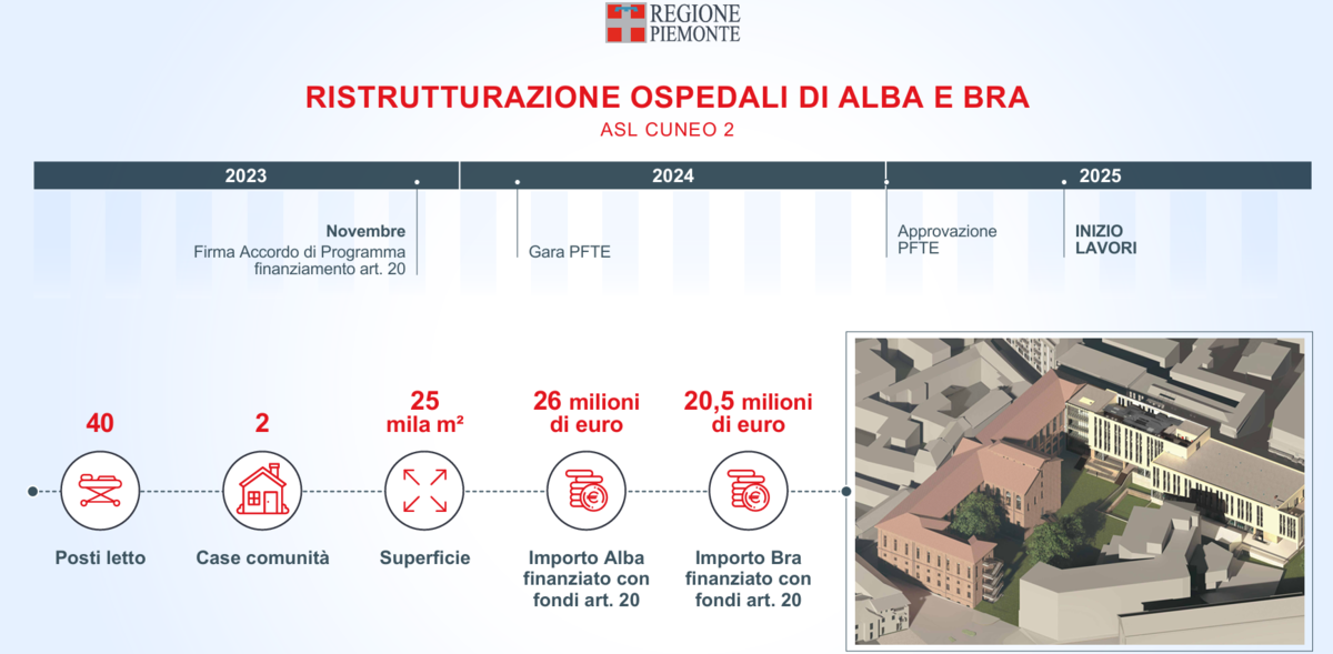 Ma tra i progetti di cui si è parlato c’è anche la ristrutturazione degli ospedali di Alba e Bra, il cui accordo di programma è già stato firmato nel novembre 2023. A cavallo tra quest’anno e il prossimo si prevede l’approvazione del progetto di fattibilità tecnico economica e nella prima metà del 2025 l’inizio dei lavori. La struttura si prevede avrà 40 posti letti divisi in due case di comunità per 25mila metri quadrati e un totale di 46,5 milioni.