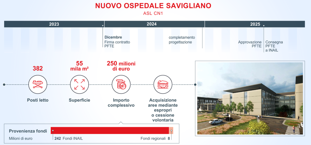 L’ospedale di Savigliano si prevede ospiti 382 posti letto per 55mila metri quadri e 250 milioni di costo di cui otto milioni in fondi regionali e 242 in fondi Inail. Attualmente si sta procedendo all’esproprio e alla cessione volontaria dei territori.