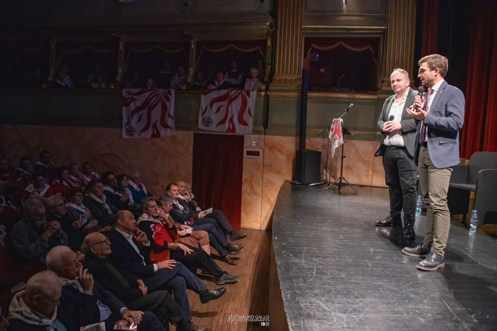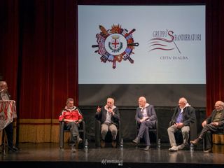 Dopo il saluto del sindaco Alberto Gatto e del vicepresidente della Fondazione Crc, l’appuntamento ha vissuto un momento particolarmente entusiasmante e divertente nel racconto dei fondatori del gruppo, a partire dal mitico “Gigetto”, al secolo Luigi Giacosa, che ha fatto sorridere il pubblico ricordando aneddoti e scherzi che caratterizzavano quel piccolo manipolo di otto amici staccatosi dal gruppo sbandieratori del borgo Moretta per diventare portacolori della città.