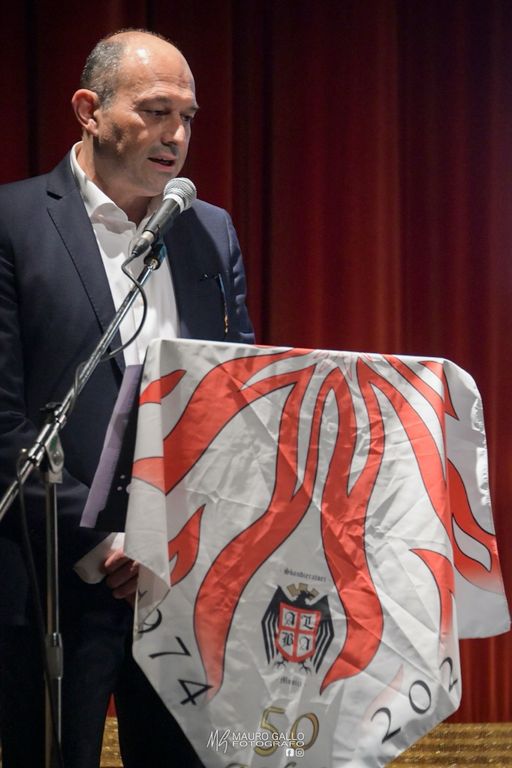 Conclusioni affidate all’attuale presidente Sergio Destefanis che ha sottolineato i passaggi chiave che hanno portato il gruppo da un primo nucleo di 8 sbandieratori, agli attuali 50 con un’anima molto femminile che ha portato nuova linfa al sodalizio e allo storico Antonio Buccolo che ha ricordato le origini degli Sbandieratori nel corso dei secoli.
