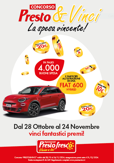 Nel corso dell’iniziativa, verranno assegnati tramite modalità "instant win" 4.000 buoni spesa del valore di 5, 10 o 20 euro, spendibili presso i punti vendita Prestofresco. In caso di esito negativo, sarà comunque possibile riprovare utilizzando un nuovo scontrino valido e partecipare all’estrazione finale del super premio: una prestigiosa Fiat 600 1.2 Hybrid 100 CV.