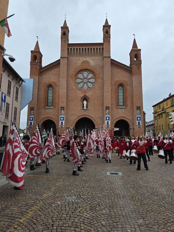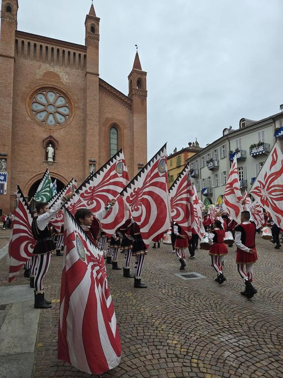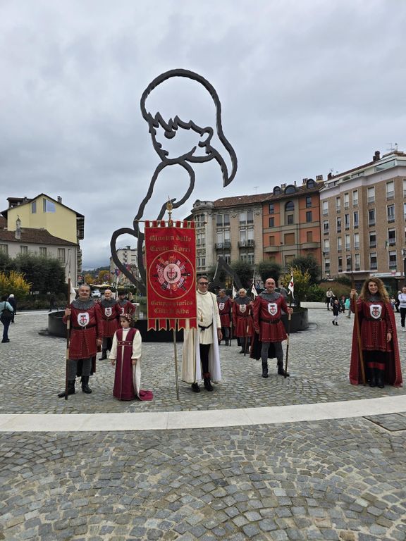 Grande festa doveva essere e grande festa è stata con l’incontro avvenuto in municipio con il sindaco Alberto Gatto prima dell’omaggio dei gruppi di sbandieratori dei borghi albesi da Patine e tesor a Santa Barbara, da Santa Rosalia a San Lorenzo per una lunga esibizione nel ricordo di Battista Destefanis e Fabrizio Pescarmona.