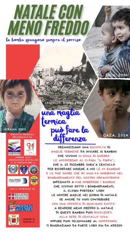 Centallo si sta preparando a ricordare gli 80 anni del bombardamento dell’orfanotrofio Perucchetti che il 29 dicembre 1944 seminò morte (14 bambini e 2 suore) e distruzione. Sfilano davanti agli occhi le immagini di macerie e piccole bare, purtroppo tanto simili alle immagini di guerra che vediamo ogni giorno in tv, con il loro corollario di bambini uccisi o mutilati, a Gaza come in Ucraina. Proprio su questo aspetto, il più intollerabile tra quelli orrendi della guerra, si sofferma la commemorazione che Centallo viva ha preparato in memoria di questo anniversario. E, in memoria delle vittime di allora, un aiuto concreto alle vittime di oggi: l’acquisto di maglie termiche per aiutare i bambini che vivono sotto i bombardamenti a trascorrere “con meno freddo” le prossime feste natalizie.