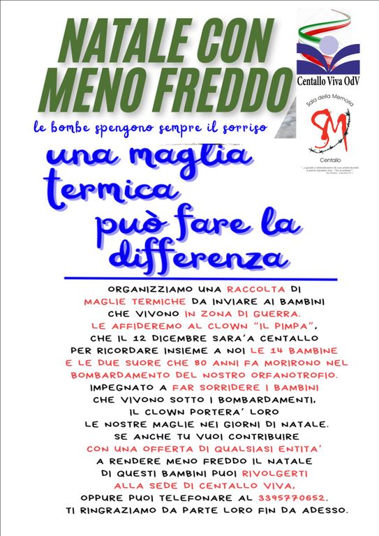 Non si tratta, in fondo, che di una campagna di solidarietà rivolta a tutti, non solo ai centallesi, affinché raccolgano maglie termiche da donare ai bambini ucraini che vivono nelle zone di guerra. Come alternativa, forse più semplice, è anche possibile fare donazioni in denaro, nella certezza che tutto verrà impiegato da Centallo Viva per questa specifica finalità. Le maglie verranno affidate al “claun Il Pimpa” che il 12 dicembre sarà a Centallo, in arrivo dall’Iraq, per ricordare le vittime del bombardamento centallese, e che presto lascerà nuovamente l’Italia per raggiungere la martoriata terra ucraina proprio nei giorni di Natale. “Il Pimpa” è figura singolare. Al secolo Marco Rodari, è originario di Leggiuno, in provincia di Varese, e da quando ha 18 anni (oggi ne ha 48) fa il “clown di guerra”. Il suo obiettivo è “divertire i bambini perché dimentichino la guerra”, “donare loro la meraviglia” e “insegnare loro qualche gioco perché diventino portatori sani di pace”. Con i suoi amici della Onlus “Per far sorridere il cielo”, ha avviato una serie di progetti in Siria, Iraq, Cisgiordania, Gaza, Israele, Ucraina, Egitto e Italia affiancando agli spettacoli di magia e ai laboratori per bambini il sostegno alimentare e medico a famiglie bisognose, donazioni di libri e di elettrodomestici e la ricostruzione di abitazioni distrutte.