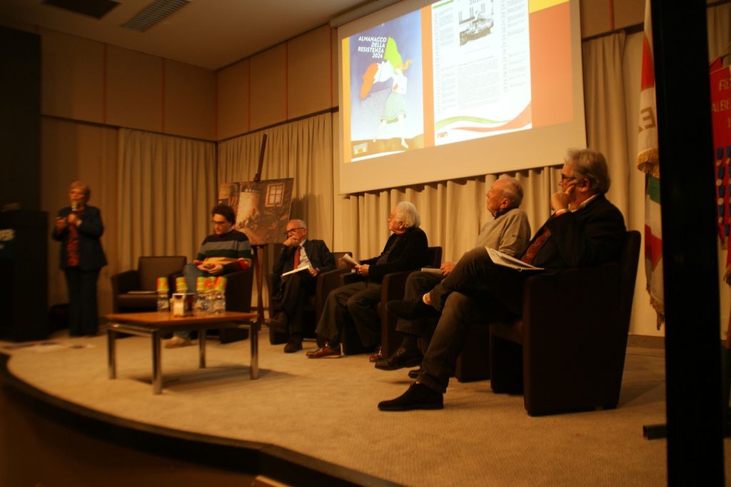 Marina Isu, consigliera comunale, ha salutato con una panoramica sulle varie edizioni dell’Almanacco: la prima, nata nel 2022, su sollecitazione di un membro dell’Anpi, Maurizio Boero, con interventi scritti di alcuni storici. Poi il 2023 che ha visto il primo coinvolgimento delle scuole. In particolare erano stati gli allievi del Mucci a collaborare, con l’impaginazione grafica. Nel 2024 ancora le scuole protagoniste che non solo si sono limitate alla parte grafica, ma hanno dato il proprio contributo scritto, partendo da una domanda: “come si viveva in quel periodo”, analizzando aspetti della vita quotidiana, dall’economia alla scuola, ai mezzi di comunicazione.