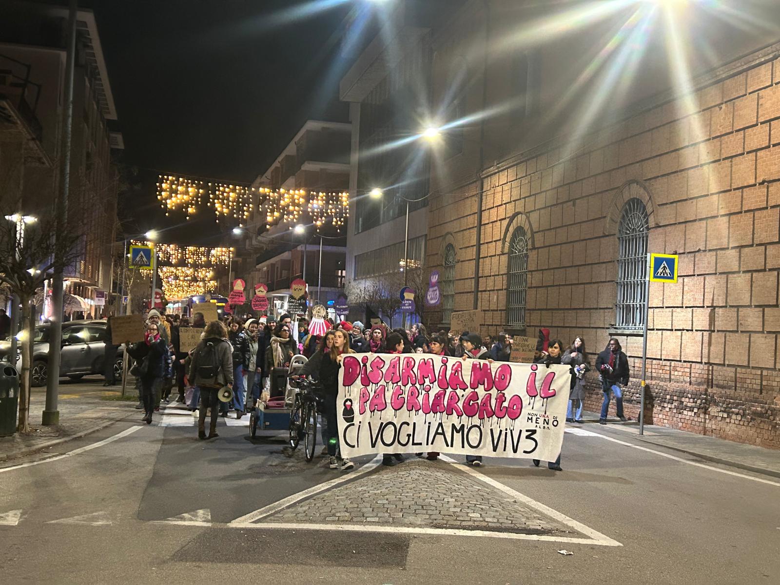 La manifestazione ha preso il via alle ore 18.30 dai Giardini Maestri del Lavoro in corso Piave, luogo che per Non Una Di Meno è divenuto un presidio permanente. Qui è collocata un’installazione artistica composta da 136 pañuelos fucsia, simbolo delle vittime di femminicidio dal 2023 ad oggi, che denunciano il dramma di chi ha perso la vita per mano di uomini incapaci di accettare la libertà delle donne.