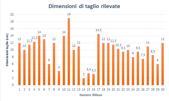 Come si può osservare nel grafico sottostante (fig.4), subito dopo il passaggio della cimatrice, sono state rilevate, in modo randomizzato, le dimensioni dei tagli nelle differenti tesi. Ad emergere sono state incisioni importanti comprese tra 12 e 20 cm, che richiedono una gestione e cicatrizzazione adeguata a ridurre il rischio di attacchi parassitari.