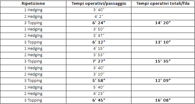 Durante la cimatura meccanica sono stati rilevati inoltre i tempi di avanzamento e le differenti velocità di lavoro, riportate di seguito in tabella (fig.5) in cui si sono registrati tempi operativi di circa 12-16 minuti per ciascuna fila costituita da 25 piante.