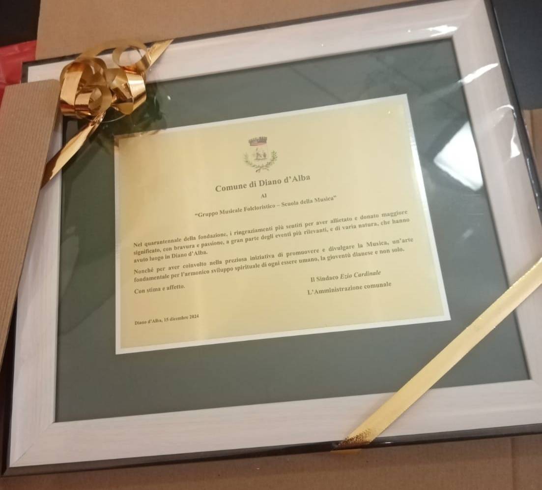“Nel quarantennale della fondazione, i ringraziamenti più sentiti per aver allietato e donato maggiore significato, con bravura e passione, a gran parte degli eventi più rilevanti e di varia natura che hanno avuto luogo in Diano d’Alba. Nonché per aver coinvolto nella preziosa iniziativa di promuovere e divulgare la Musica, un’arte fondamentale per lo sviluppo spirituale armonico di ogni essere umano, la gioventù dianese e non solo”.
