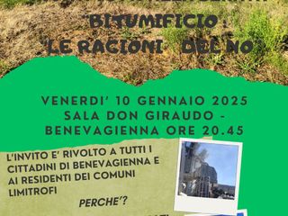 Su iniziativa del Comitato “Per il Bene Comune” venerdì sera alle 20.45 nella sala don Giraudo di Bene Vagienna si propone un incontro pubblico sul tema del “bitumificio: le ragioni del no”.