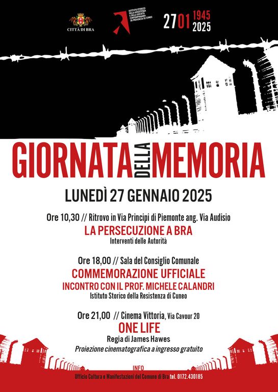 Le iniziative del Giorno della Memoria sono organizzate dal Comune di Bra in collaborazione con l’Istituto storico della Resistenza e della Società contemporanea di Cuneo. Maggiori informazioni presso l’Ufficio Cultura e Manifestazioni (0172.430185 – turismo@comune.bra.cn.it).