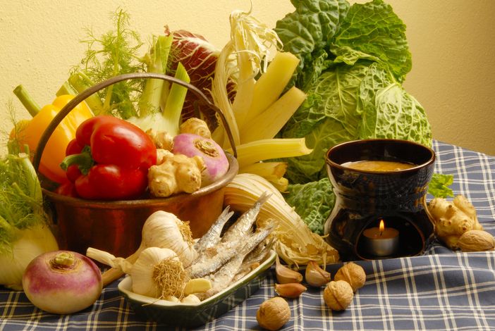 La bagna cauda è un piatto della tradizione e della convivialità diffuso nel mondo ovunque vi siano piemontesi. Un intingolo caldo di olio, acciughe e aglio che accoglie ogni tipo di verdura dell’orto, “pucciate” nel fujot e accompagnate da pane e vino. Ci sono i cardi, ma anche i cavoli, le rape, la biarava rossa, le patate e le cipolle bollite, i porri, topinambur, i sedani. La Bagna Cauda ha accompagnato gli inverni di decine di generazioni contadine. È un rito antico tornato attuale con l’aggiunta di un ingrediente: l’ironia.