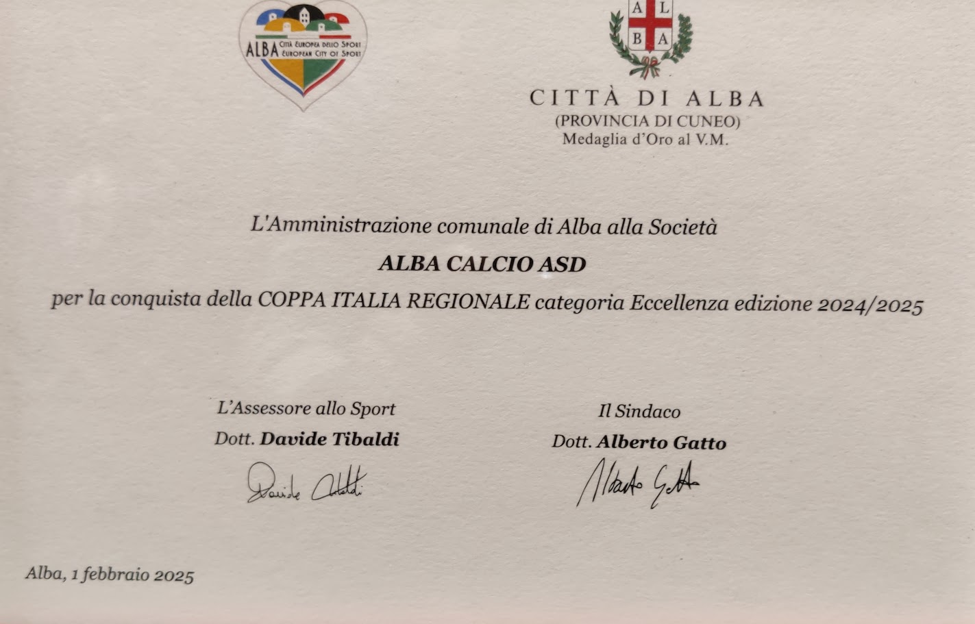 Ricevuti dal sindaco Alberto Gatto e dall’assessore allo sport Davide Tibaldi, i protagonisti dell’impresa hanno ricevuto in una targa ricordo da parte dell’amministrazione comunale e tanti complimenti, anche per il buon percorso nella regular season, che vede l’Alba Calcio in piena zona play off, a 3 punti dalla vetta, dopo 18 partite.