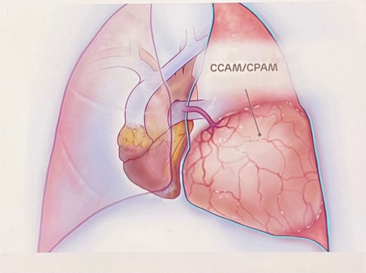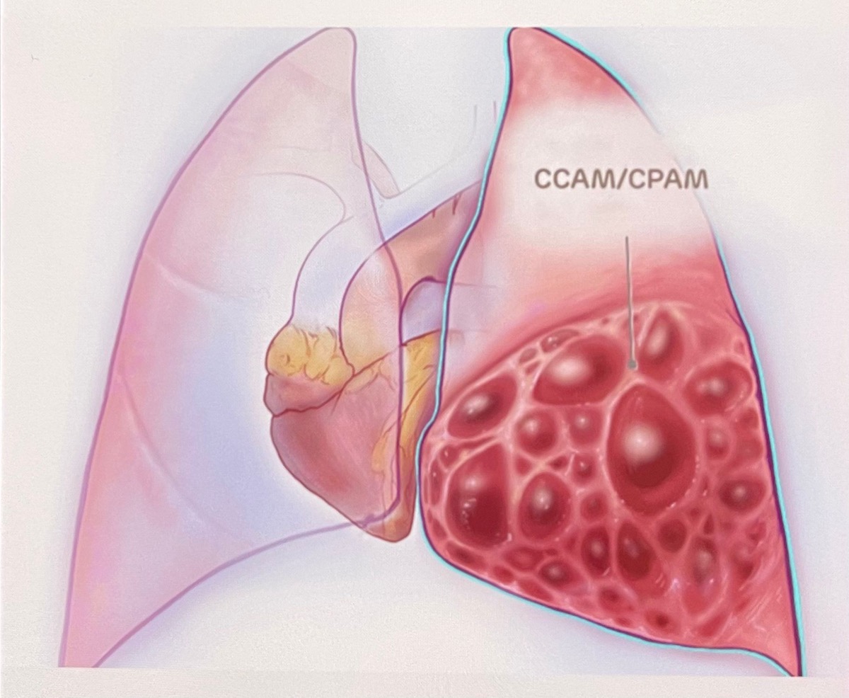 Si tratta di una malformazione adenomatoide cistica polmonare (CCAM), una patologia congenita, di causa ad oggi ignota, cioè una malformazione benigna del polmone con alterazione dello sviluppo dei bronchioli terminali, che subiscono una trasformazione cistica fino a portare a una completa alterazione del parenchima polmonare.