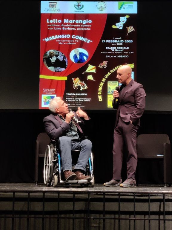 Il duo Lello Marangio/ Lino Barbieri ha poi replicato la performance in serata, davanti ad una folta platea: irriverenti, dissacranti, autoironici i due artisti hanno divertito e portato all’attenzione le tante contraddizioni che contraddistinguono il mondo della disabilità, soprattutto quando ad occuparsene sono i cosiddetti “normali”.