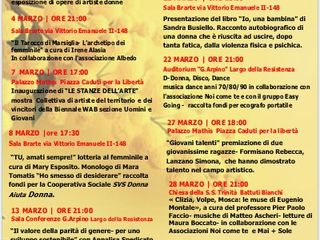Anche quest’anno è previsto un fitto programma di iniziative di diverso genere. Innanzitutto, per tutto il mese i negozi della città ospiteranno un’esposizione diffusa di opere di artiste donne dal titolo “Da vetrina in vetrina – l’arte al femminile”. La speranza è che il linguaggio dell’arte possa stimolare una riflessione anche in coloro che non si sono mai approcciati al problema.