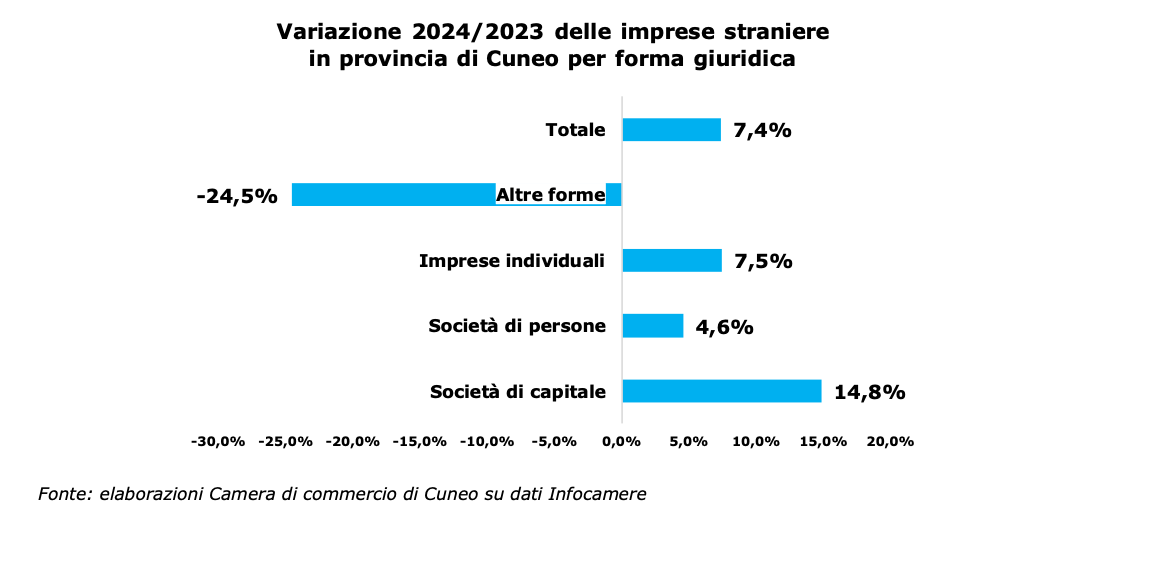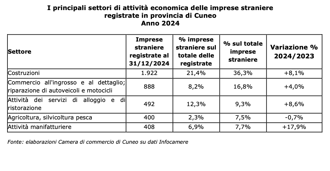 Nel 2024 il numero delle imprese straniere è aumentato in misura significativa, largamente superiore alla crescita in Piemonte e nel resto del Paese, seguendo un trend consolidato che, negli ultimi dieci anni, ha visto aumentare del 38% il numero delle imprese straniere nella nostra provincia - afferma il Presidente Luca Crosetto -. In alcuni settori la presenza straniera è ormai determinante e risponde a esigenze specifiche della nostra comunità, portando un contributo essenziale non soltanto alla crescita economica ma anche dal punto di vista della coesione sociale e dell'integrazione culturale".