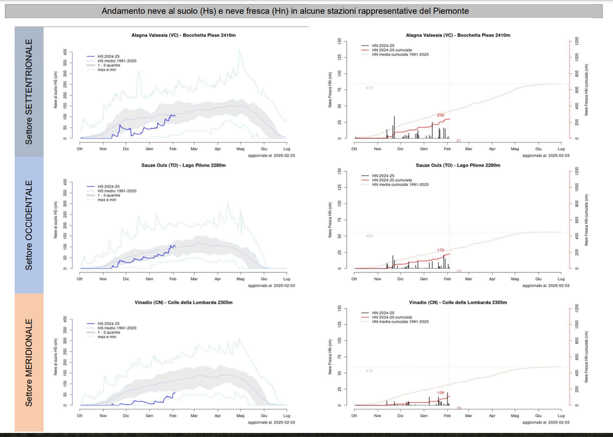 Come si può evincere dall'ultimo bollettino idrologico mensile dell'Arpa Piemonte, al 3 febbraio la situazione della copertura nevosa sulle Alpi settentrionali e occidentali era pressoché in linea con l'accumulo medio al suolo previsto per il periodo, mentre sulle Alpi Marittime la situazione mostrava un deficit attorno al 50%.