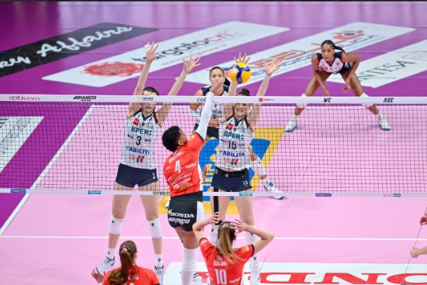 Apre il match Cese Montalvo al servizio e subito finalizza Cecconello in primo tempo, 1-0. Cese Montalvo in pipe, 1-1. Bjelica sulle mani alte del muro, 2-1. Martinez a segno, 3-1. Polder in fast, 4-1. Murata Martinez, 4-2. Murata Piani da seconda linea, 5-2. Cese Montaldo in pipe, 5-3. Ancora l’attaccante cubana in mezzo al muro, 5-4. Polder in fast, 6-4. Ace di Polder su Cese Montaldo, 7-4. Piani in pipe, 7-5. Ace Manfredini forte sulla diagonale 5 verso 5, 7-6. Bjelica da seconda linea, 8-6. Piani murata dalla seconda linea: 9-6. Cese Moncalvo sopra il muro, 9-7. Cecconello in primo tempo, 10-7. Doppio di Armini su secondo tocco, 11-7. Cese Montaldo in diagonale stretta, 11-8. Martinez sulle mani alte del muro, 12-8. Kapralova in pipe, 13-8 e primo time out Bergamo. Mlejnkova millimetrica in parallela, 13-9. Out il servizio di Strubbe, 14-9. Murata Piani da Cecconello, 15-9. Kapralova da seconda linea, 16-9. Piani forte in mezzo al mueo, 16-10, entra Adriano per Evans. Subito a segno Adriano sulle mani del muro, 16-11. Out l’attacco di Martinez, 16-12. Ancora Kapralova da seconda linea e entra Carraro per Piani, 17-12. Adriano sulle mani alte del muro, 17-13. Bjelica in pipe, 18-13. Ace di Bjelica millimetrico, 19-13 e secondo time out Bergamo. Cese Moltando in pallonetto tra zone di conflitto, 19-14. Out il servizio di Manfredini, 20-14. Bjelica in pallonetto e grande attacco di Adriano in diagonale stretta: 21-15. Piani vincente sulla diagonale, 21-16. Contrasto a rete vinto da Kapralova, 22-16. Imprecisione di Bergamo sul secondo tocco, finalizza Bjelica, 23-16, entra Farina per Strubbe. Out Cese Montaldo, 24-16, la chiude Bjelica in diagonale stretta, 25-16. Best scorer Bjelica con 7 punti, seguita da Polder, 6. Per le ospiti Cese Montalvo con 6.