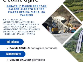 L'incontro nel Salone Alberto Bianco, in piazza Regina Elena, a Valdieri vuole riportare l'attenzione sulla paralisi di alcune infrastrutture. L'incontro sarà introdotto dal consigliere comunale Davide Tonello e moderato dal giornalista Claudio Calorio. Interverranno Paolo Chiarenza, ex consigliere provinciale, Guido Giordana, sindaco di Valdieri, Maurizio Paoletti, ex sindaco di Boves e Giuseppe Menardi, ex senatore ed ex sindaco di Cuneo.
