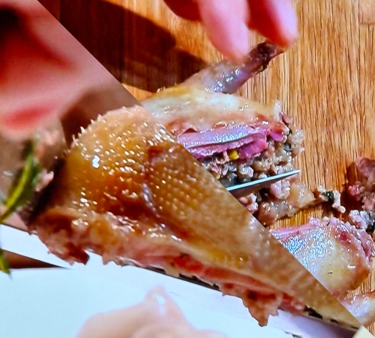 I concorrenti dovevano cucinare un piccione ripieno, da disossare, cotto in un cedro. Il tutto in 75'. Simone è stato il più bravo e veloce fin dall'inizio: 13 minuti per disossare il piccione, ripieno con una farcia a base di castagne, prugne, vitello e pistacchi che ha mandato in visibilio i tre giudici. Ma anche Colagreco. Come contorno una chips di topinambour.