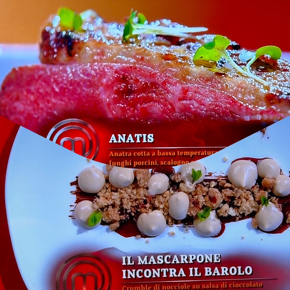 Il secondo presentato da Grazioso è stato "Anatis",anatra cotta a bassa temperatura con il suo fondo, funghi porcini, scalogno e peperoni gialli di Carmagnola. Infine, il dessert, che Simone ha chiamato "Il mascarpone incontra il Barolo", dedicato allo suocero scomparso e tipicamente delle Langhe.