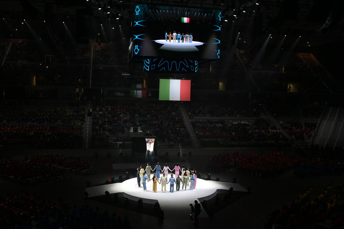 Il Team Italia è stato l’ultimo a sfilare sul parterre dell’Inalpi Arena con una delegazione di 88 persone (63 atleti, 22 tecnici e 3 delegati) ricevendo l’ovazione del pubblico che ha partecipato con gioia alla Cerimonia. La coreografia ha esplorato i temi dell’avvicinarsi, della relazione tra i corpi e della diversità. Anche il palco è stato protagonista, interagendo con i performer con rotazioni e pause, creando momenti evocativi di separazione e unità. A seguire i discorsi ufficiali.