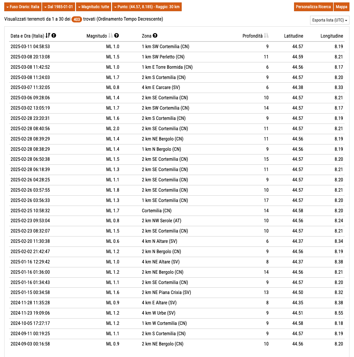 Proseguono intanto le scosse, certamente di minore intensità, che da alcune settimane interessano la zona di Cortemilia, nelle Langhe, al confine con le province di Asti, Alessandria e Savona, toccando anche i confinanti centri di Bergolo, Serole (At) e Piana Crixia (Sv).