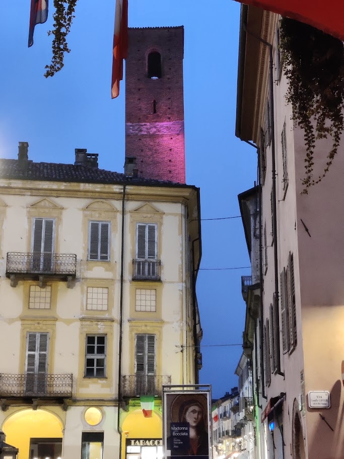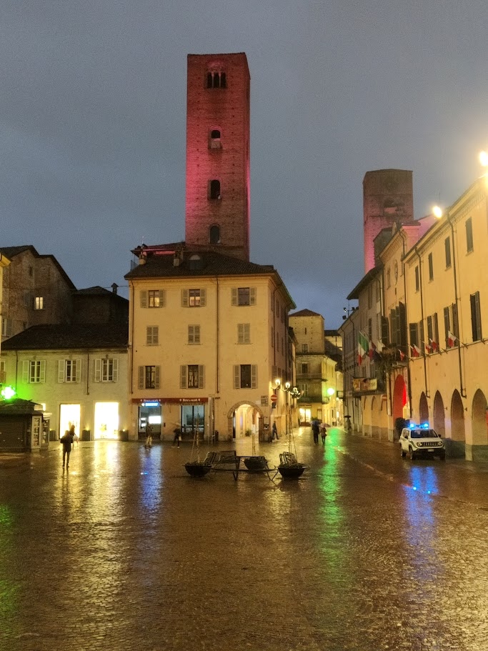 In queste notti le torri della città di Alba sono state illuminate da luci color lilla.