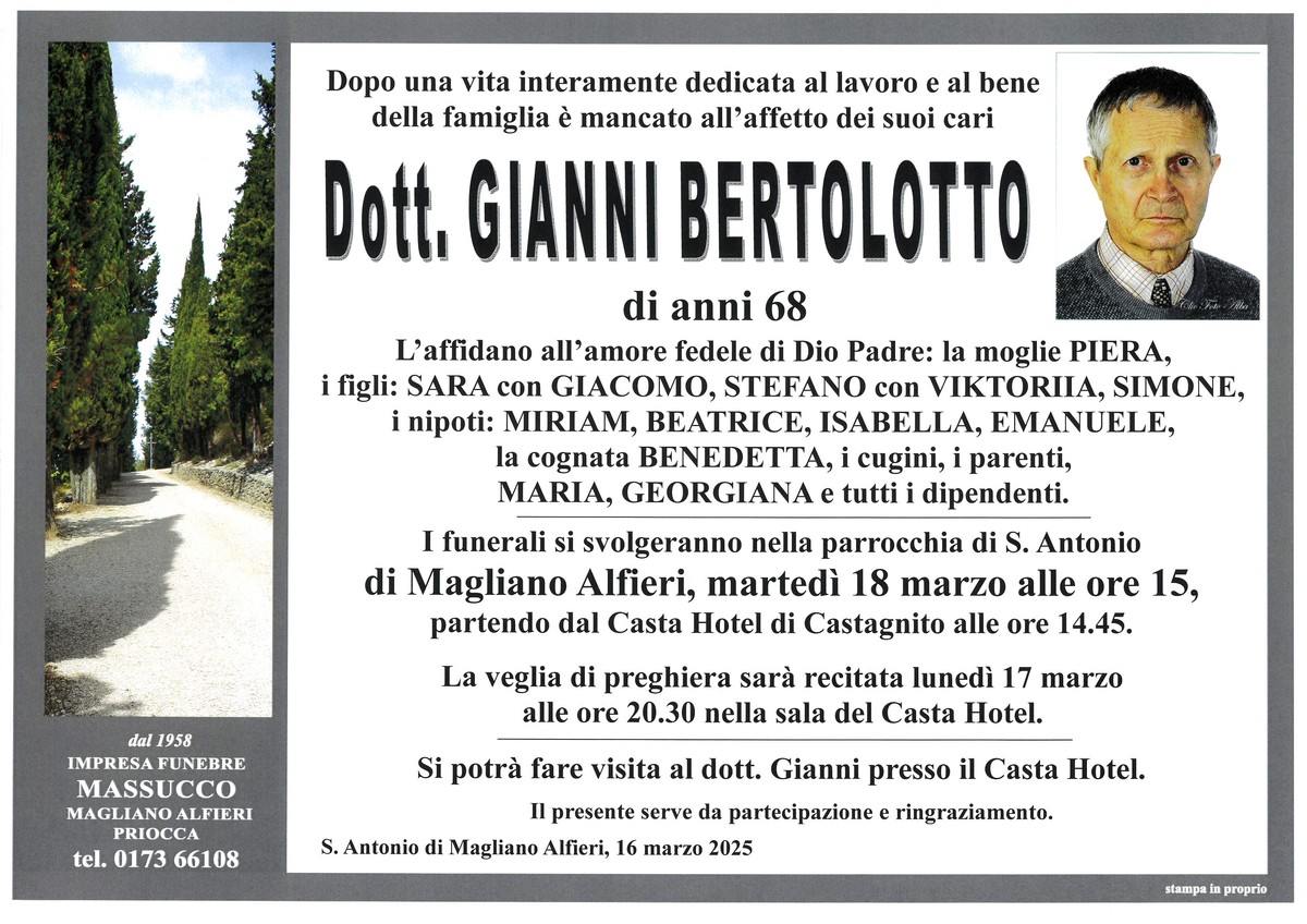 Insieme alla moglie, il dottor Bertolotto lascia i figli Sara con Giacomo, Stefano con Viktoria e Simone; i nipoti Miriam, Beatrice, Isabella ed Emanuele; la cognata Benedetta e i cugini; poi Maria, Georgiana e tutti i dipendenti della struttura ricettiva castagnitese e della pizzeria che la famiglia possiede ad Alba da alcuni anni.