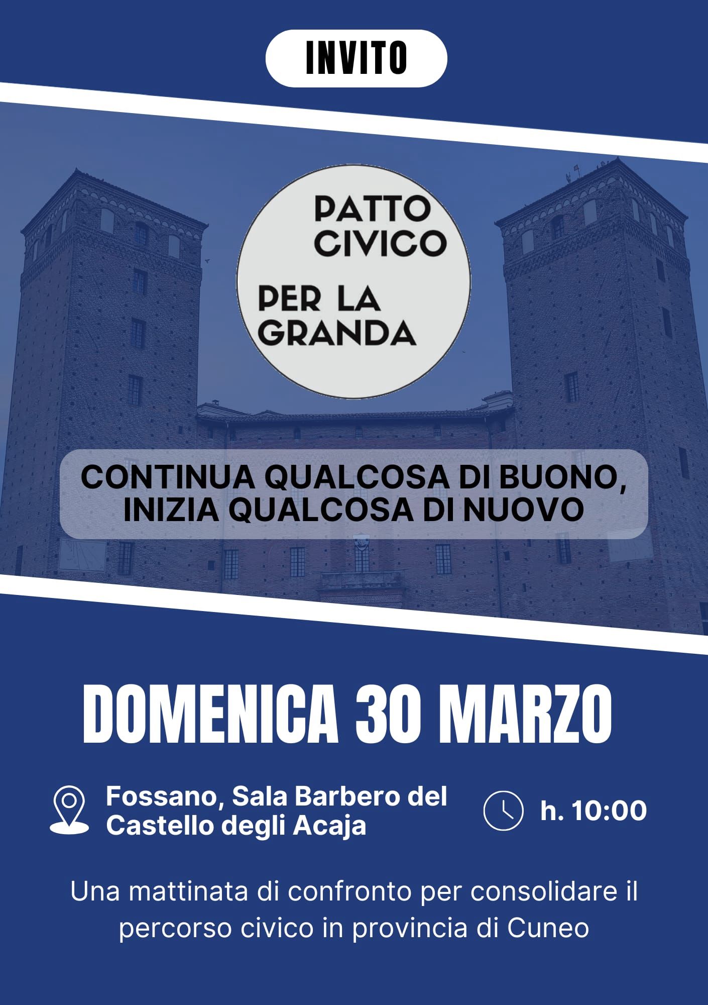 Il Patto Civico diventa associazione provinciale con l’intento di acquisire sempre maggiore peso nell’area moderata di centrodestra. All’insegna dello slogan “Continua qualcosa di buono. Inizia qualcosa di nuovo”, domenica 30 marzo, nella sala Barbero del castello degli Acaja, a Fossano alle ore 10, ci sarà il vernissage.