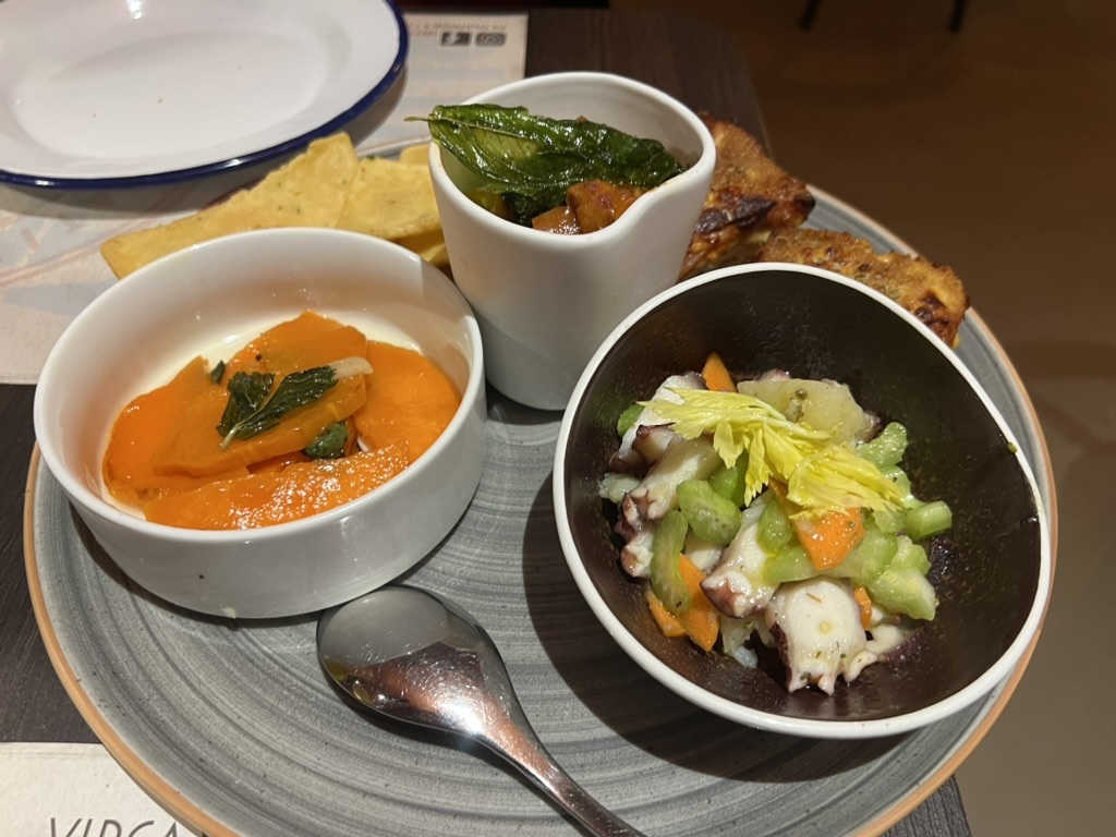 Conosco Buatta fin da quando ha aperto a Palermo. E, se la versione proposta a Torino al Mercato centrale non mi aveva convinto del tutto, in questa nuova sede ho ritrovato le atmosfere dei miei lontani ricordi siciliani. Così, per farmi subito un’idea a tutto campo di dove va qui la cucina, comincio con la Degustazione Buatta: una zucca marinata perfettamente equilibrata; un polpo tenero e ben valorizzato dal contrasto con le verdure croccanti; una caponata nella quale le verdure, tagliate a grossi pezzi, lasciano emergere in bocca tutta la forza le loro sapore. Morbidissimo anche il trancio di sfincione e fragranti le panelle di farina di ceci.