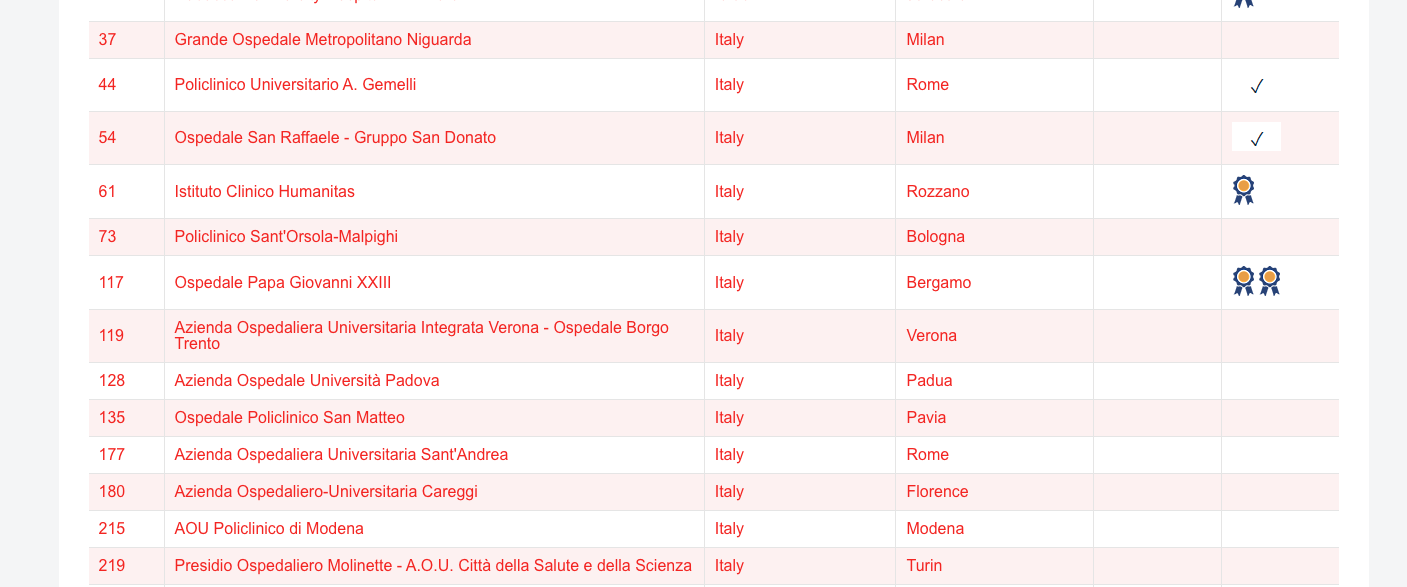 Per trovare il primo nosocomio italiano nella classifica mondiale, dobbiamo andare al 37° posto, dove troviamo il Niguarda di Milano. Seguono il Policlinico Gemelli di Roma e il San Raffaele, di nuovo a Milano.