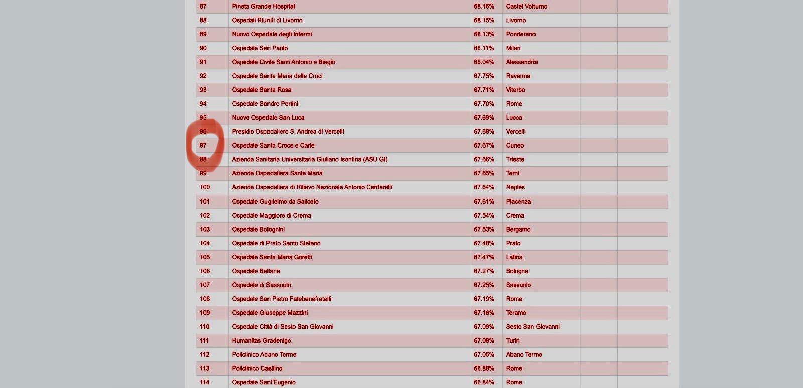Molto in basso. Per trovare, infatti, il primo (e unico) nosocomio della nostra provincia nella classifica solo nazionale, dobbiamo scendere alla 97ª posizione su 133, dove troviamo l'ospedale hub della provincia, il Santa Croce e Carle di Cuneo.