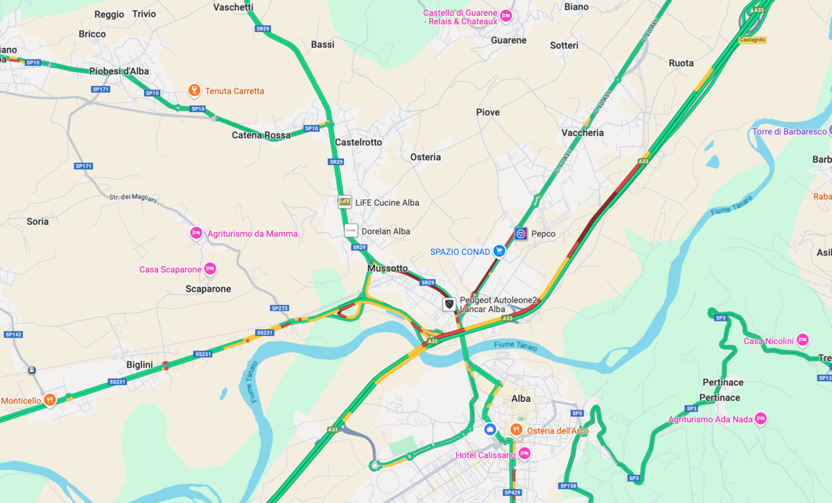 Stamattina – specialmente tra le ore 8 e le 9, con quella del pomeriggio la fascia oraria di maggiore concentrazione del traffico –, è andato in scena un nuovo assaggio della stagione di passione che attende gli albesi, con tutta la viabilità di ingresso alla città costretta ad avanzare per lunghi tratti a passo d’uomo. Come dimostrano bene le mappe in tempo reale offerte dai diversi servizi di navigazione per auto.