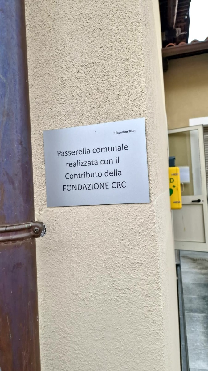 Il manufatto è stato realizzato grazie al generoso contributo di 20mila euro erogato dalla Fondazione CRC, che ha coperto oltre il 60% del costo complessivo dell’opera e ha sostituito la vecchia passerella in legno degli anni ’90, ammalorata e danneggiata dagli eventi atmosferici dello scorso anno.