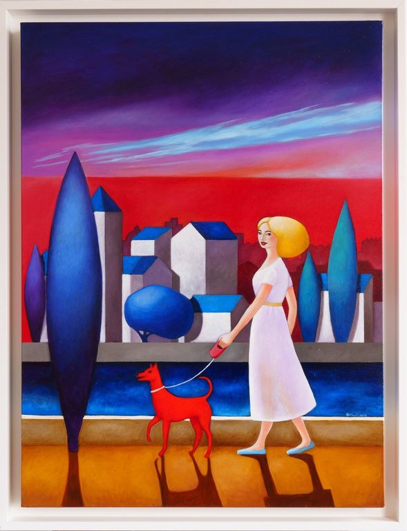 Nelle trenta tele esposte a Palazzo Mathis viene proposto un viaggio tra i suoi passaggi figurativi, dove s’avverte la sospensione del tempo e trapela un virtuosismo, da esercizio quotidiano, che detta pause e le cromie sature sagomano case, alberi, animali, mari, pesci, persone, cieli e lune. Un’elaborazione pittorica dai tratti precisi e determinati, nonché sostenuta da campi cromatici ben valutati e calibrati, raggiungendo una dimensione visionaria, magica e onirica che va al di là del tempo reale.