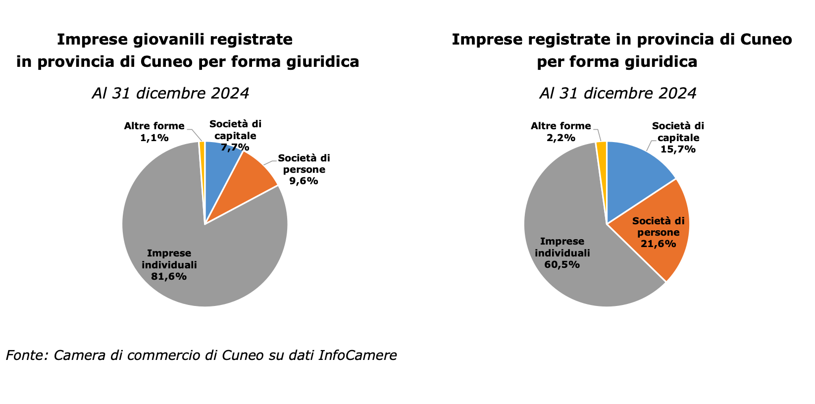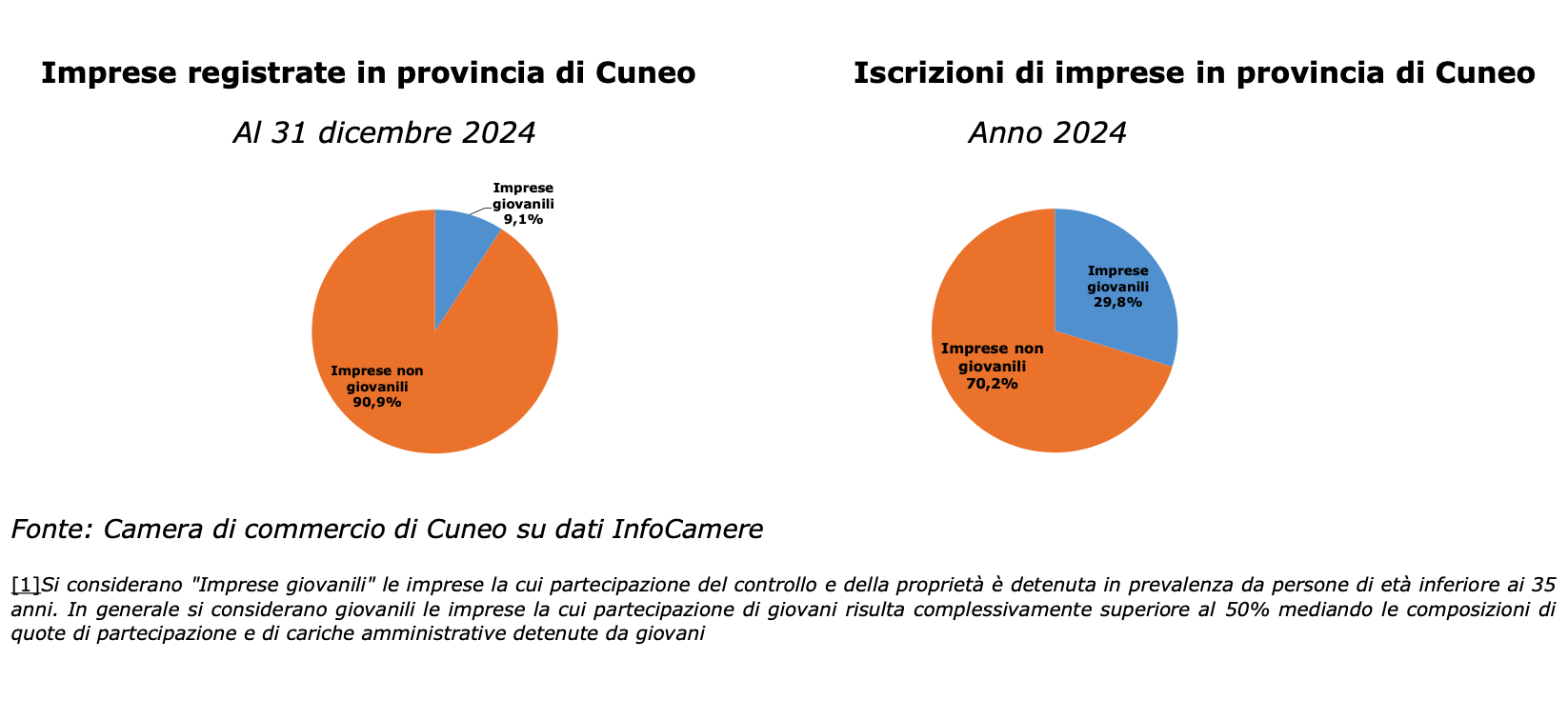 A fine 2024 le imprese giovanili iscritte nel Registro Imprese della Camera di Commercio di Cuneo sono 5.900 e rappresentano il 9,1% delle attività aventi sede legale sul territorio provinciale e il 16,2% delle 36.530 realtà guidate da giovani registrate in Piemonte. Nel 98,1% dei casi si tratta di microimprese, ovvero aziende con un numero di dipendenti inferiore alle dieci unità. Questa elevata percentuale avalla il concetto che il sottodimensionamento sia ancora più diffuso tra le imprese giovanili. Nel Cuneese a fine 2024 le imprese giovanili hanno registrato una flessione dell’1,5% e, seppur negativa, migliore rispetto a quella piemontese e nazionale che si attestano rispettivamente a -2,6% e -3,6%.