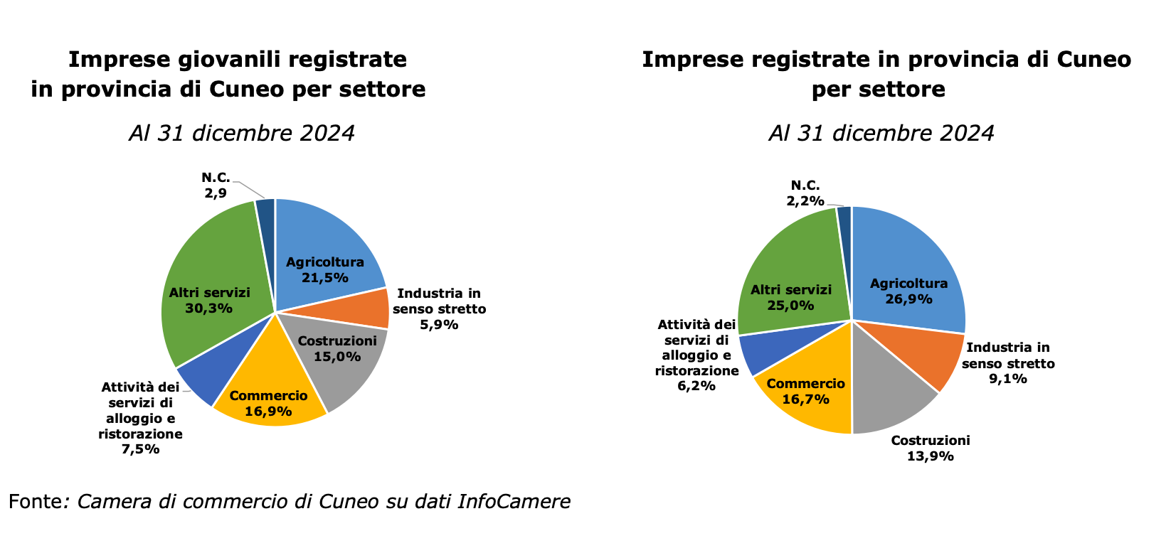 L’analisi per settori evidenzia come il primo comparto per numerosità sia quello degli altri servizi (servizi di supporto alle imprese, attività professionali, scientifiche, tecniche, altri servizi, ecc.) che pesa per il 30,3% delle imprese giovanili del Cuneese. Seguono agricoltura (21,5%), commercio (16,9%) e costruzioni (15,0%). La distribuzione settoriale dell’imprenditorialità under 35 evidenzia alcune differenze rispetto alla base produttiva provinciale che vede nell’agricoltura il primo settore di attività con una quota del 26,9%, seguito da altri servizi (25,0%), commercio (16,7%) e costruzioni (13,9%).