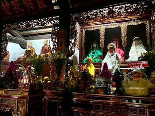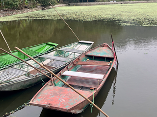 Il giorno seguente abbiamo raggiunto Trang An. Nonostante la vicinanza geografica, il contrasto è stato immediato. Tam Coc ci aveva accolti con un’atmosfera rurale e quasi intima; Trang An ci ha investiti con la forza di una macchina turistica ben oliata. Appena entrati nell’area protetta, ci siamo trovati davanti a un enorme parcheggio pieno di pullman e file perfettamente ordinate di barche in attesa. Il tragitto è durato circa due ore e mezza. Siamo passati attraverso una serie di grotte lunghe e strette, ognuna con un nome evocativo: Sang Cave, Toi Cave, Nau Ruou Cave. L’acqua era immobile come uno specchio e rifletteva le stalattiti e le pareti di pietra in un gioco ipnotico di luci e ombre. In alcuni punti, la roccia ci ha sfiorato la testa! Sulla superficie del fiume, il traffico di barche era continuo. Alcuni tratti del percorso somigliavano più a una tangenziale fluviale, eppure la bellezza del paesaggio era fuori discussione. I templi nascosti sulle rive, raggiungibili solo via fiume, aggiungevano un tocco di mistero e spiritualità. Abbiamo attraccato per visitarne uno: un piccolo santuario immerso nella vegetazione, dove il profumo dell’incenso si mescolava all’umidità del muschio. Uno spettacolo, confezionato in maniera perfetta, per i molti visitatori!