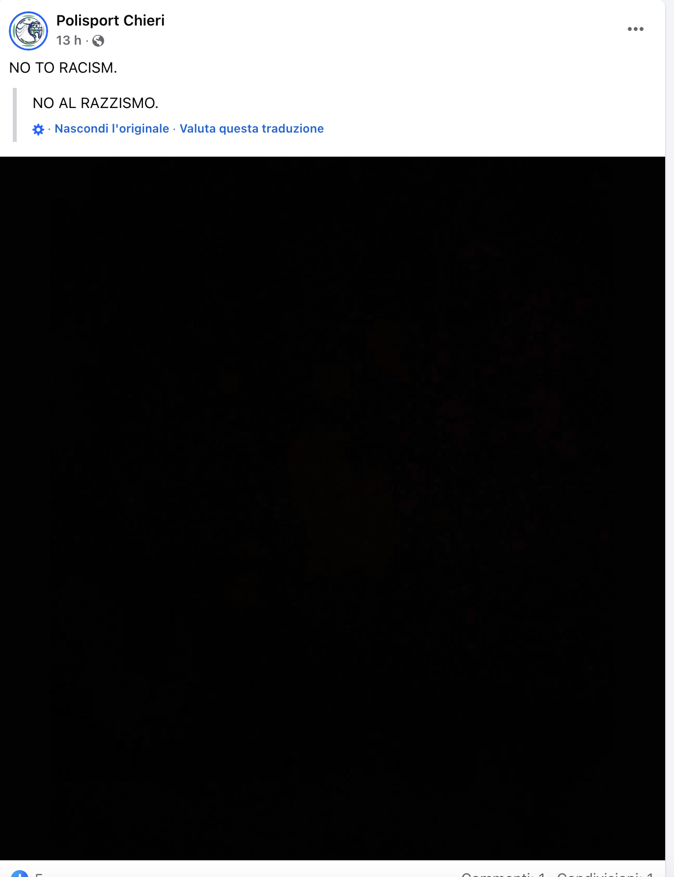 Intanto da ieri sera sulla pagina Facebook della Polisport Chieri è comparso un post con lo sfondo nero e la scritta: "No al razzismo"