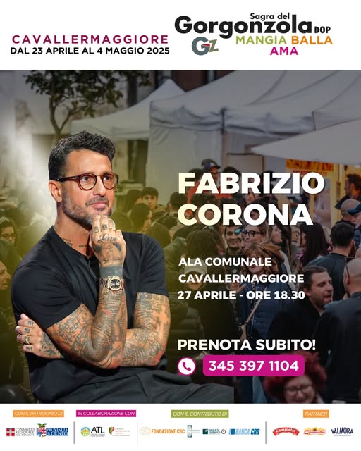 Non meno eclatante è stato lo scherzo orchestrato dalla Pro Loco di Cavallermaggiore, che ha annunciato un super ospite per la Sagra del Gorgonzola: Fabrizio Corona, ex "re dei paparazzi", oggi youtuber e influencer. L’annuncio era accompagnato da una locandina estremamente curata, completa di loghi ufficiali degli sponsor e degli enti organizzatori, aumentando così la sua credibilità.