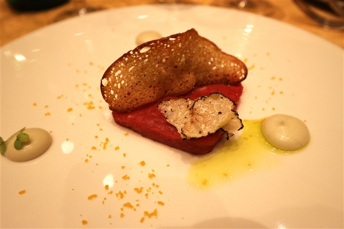 Antipasto: Si è aperto con una delicata Cruda di Cazzamali, accompagnata da un cremoso gorgonzola Bassi, arricchita da un tocco di pregiato tartufo nero Urbani. Questo piatto, concepito dal talentuoso chef Gianni Tarabini del rinomato ristorante “La Presef”, Agriturismo La Fiorida Mantello (So), premiato con le ambite stelle verde e rossa Michelin, è stato abbinato a un Mattia Vezzola Metodo Classico Costaripa Rosé in formato Magnum, una bollicina che ha deliziato i commensali grazie alla sua eleganza e freschezza.