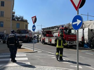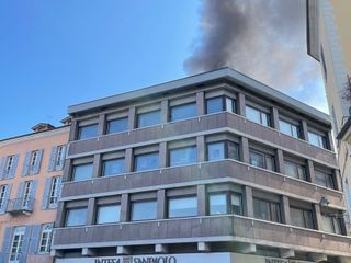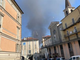 Vigili del Fuoco in azione, a Mondovì, per spegnere un incendio divampato nella zona di piazza Ellero, nei pressi dell'edificio che ospita Intesa San Paolo.